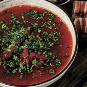 Из томленой говядины в сливочном соусе, грибами, с картофельными крокетами и битыми огурцами. Подается с кинзой и чили перцем на чугунной сковородке. -