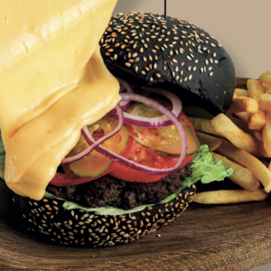 С говяжьей котлетой, листьями салата, горячим сыром гауда на раскаленной лопате, солеными огурцами, помидорами и секретным соусом, картофель фри -