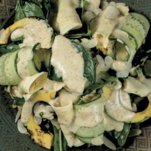 Зеленый витаминный салат из микса зелени с цитрусовой освежающей заправкой, с добавлением сельдерея, авокадо, яблока, огурцов, булгура и сыра сулгуни. -