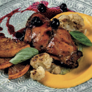 Ножка кролика конфи маринованная в диких травах, гарнируется бархатистым пюре из печеной моркови и карамелизированным апельсином. -