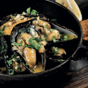 Нежная куриная печень, пропитанная ароматом трав и чеснока. Баланс вкуса дополняется яркими нотами и цитрусов и медово-ореховым соусом. -