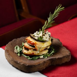 Запеченная пирамида из баклажан, томатов, моцареллы с соусом песто, руккола. -