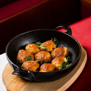 Шампиньоны с запеченным сыром Гауда с трюфельным маслом.