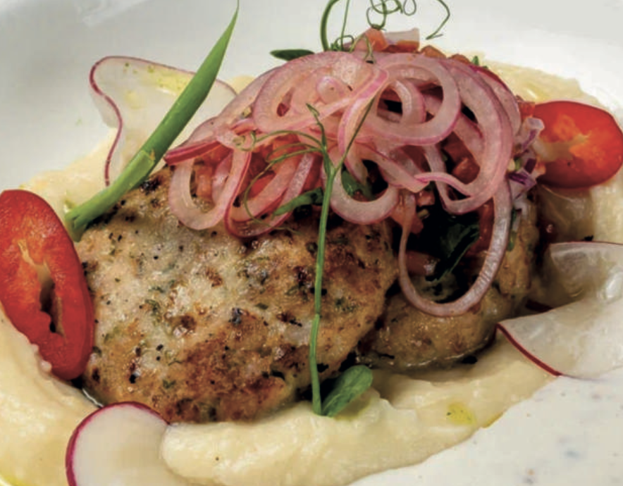 С хрустящей корочкой и картофельным пюре и подала с томатной сальсой и своим секретным сливочным соусом.