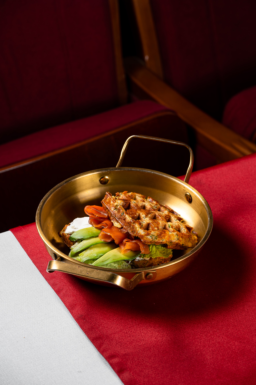 Картофельные вафли со слабосоленой форелью, авокадо, листьями салата и творожным сыром.