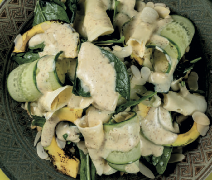 Зеленый витаминный салат из микса зелени с цитрусовой освежающей заправкой, с добавлением сельдерея, авокадо, яблока, огурцов, булгура и сыра сулгуни.