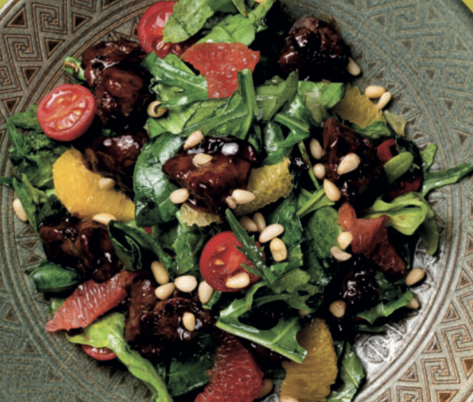 Нежная куриная печень, пропитанная ароматом трав и чеснока. Баланс вкуса дополняется яркими нотами и цитрусов и медово-ореховым соусом.
