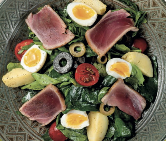 Легкий салат с тунцом-гриль, маринованном в лимоном соке и прованских травах, с добавлением мини-картофеля, сладких томатов и перепелиного яйца, заправляется медово-горчичным соусом.